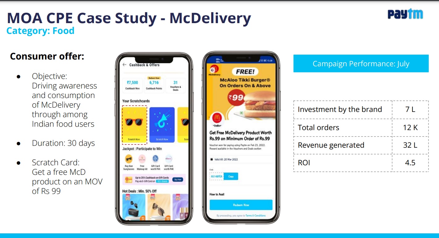 One of the most effective ways to acquire clients is through scratch card promotions on Paytm. After completing a transaction, users receive a scratch card where advertisers can display their ads in the form of coupons. Each scratch is counted as a single transaction, charges are based on the Cost Per Scratch model. Users are also prompted with a coupon discount offer to purchase products on the advertiser’s platform. This creates direct engagement with users, and charges are based on the Cost Per Engagement model, allowing advertisers to drive meaningful interactions and boost conversions.